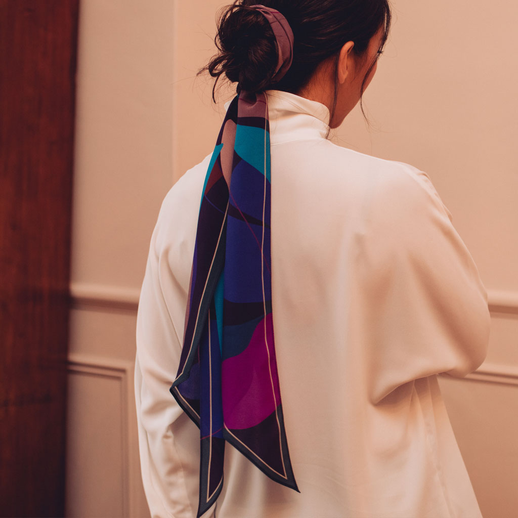 The Tamara scarf is a versatile long silk scarf, perfect for cool spring and summer days around your neck or beautifully tied in around the head.