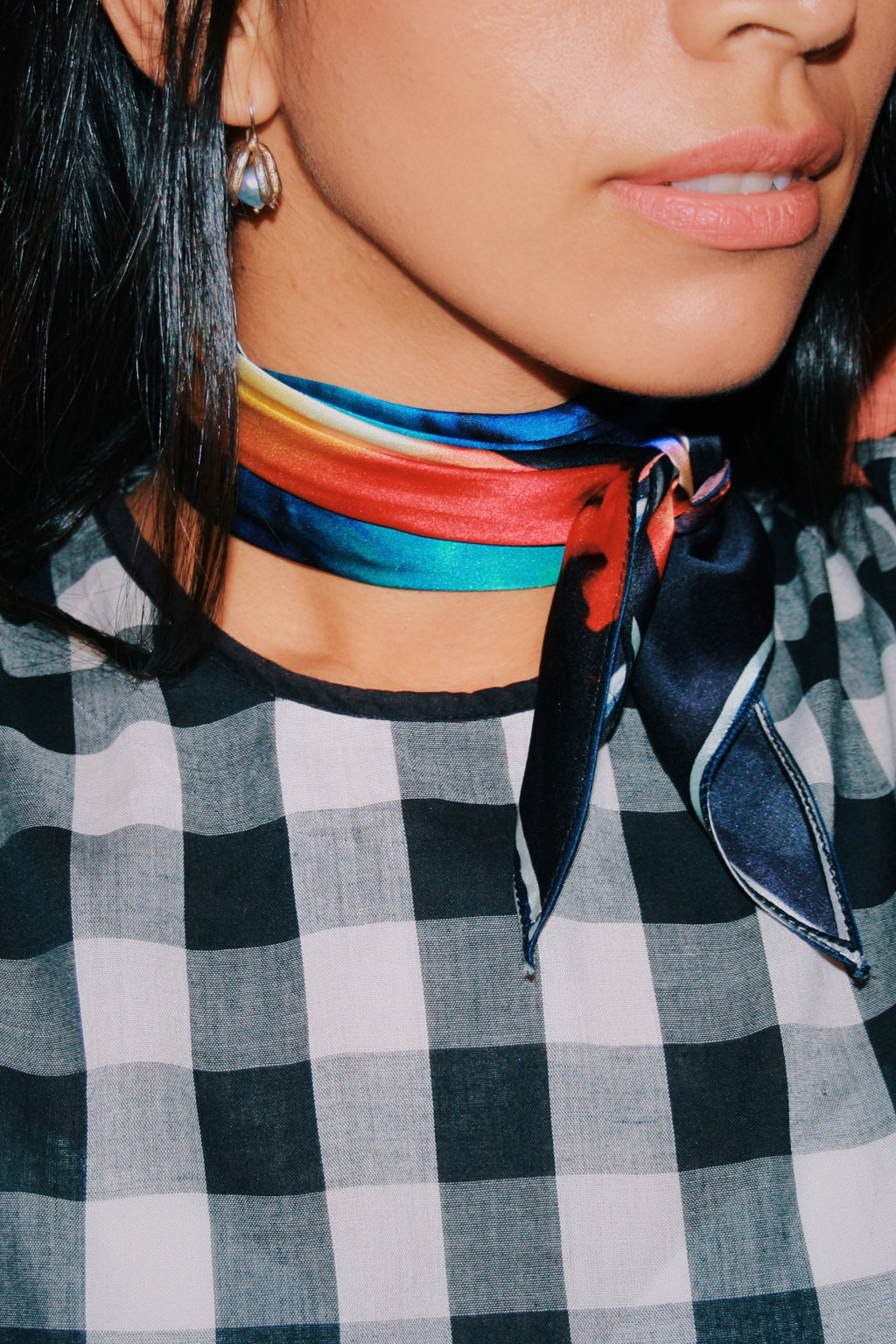 The Terra Triangle scarf is the perfect slice of silk perfection. This small scarf is designed to wrap elegantly around the neck under a collared blouse, bringing a flash of colour to your outfit.