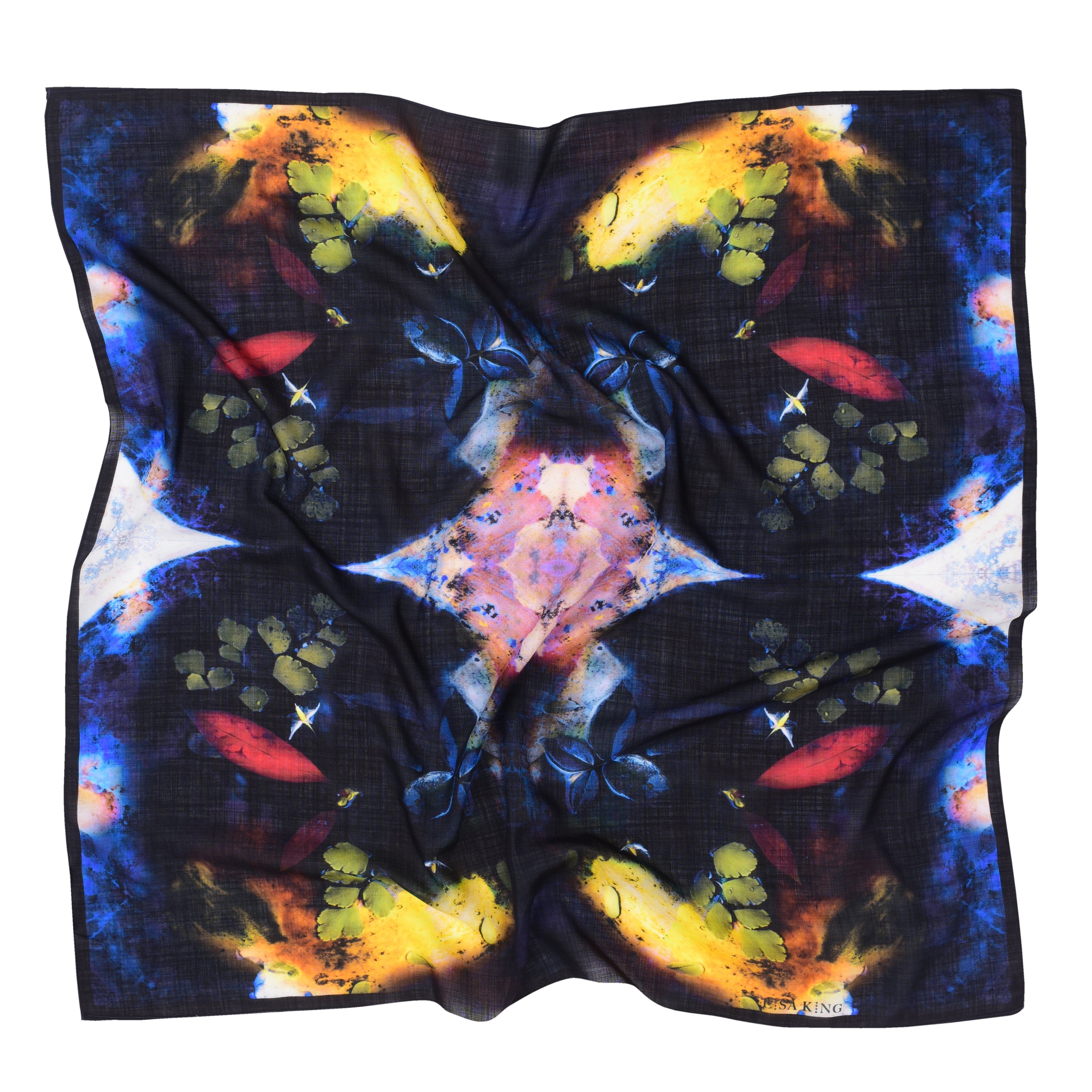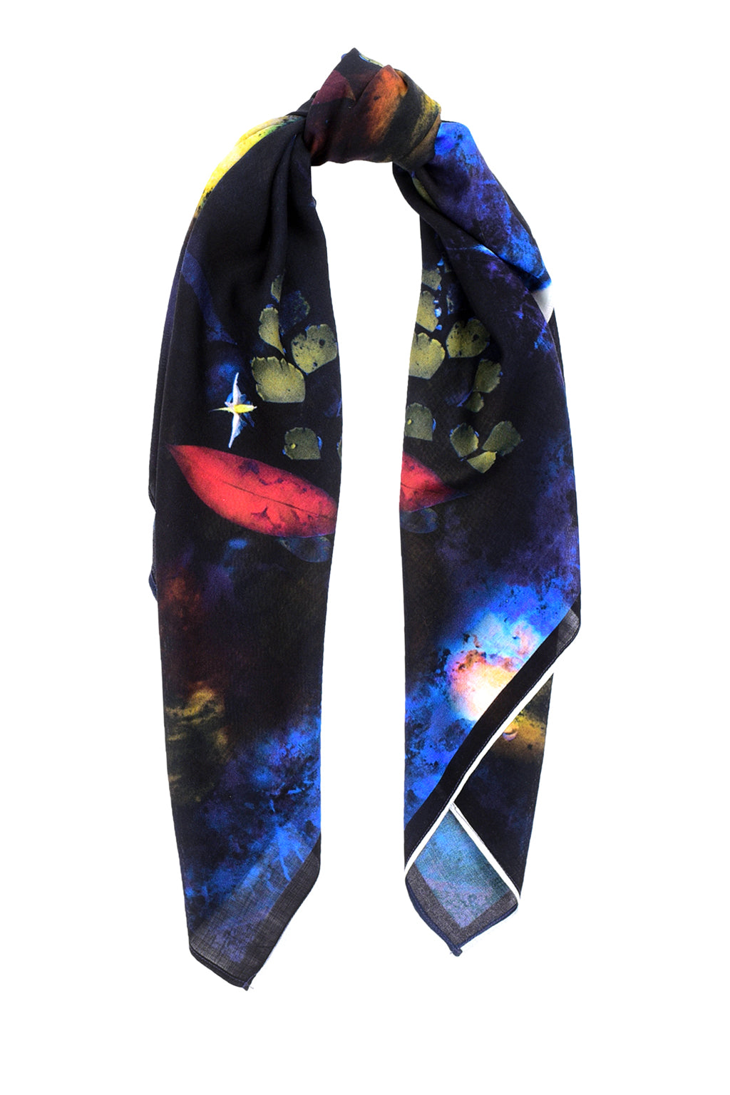 The Babylon scarf was inspired by a trip to Sri Lanka, and the photographic print features leaves and flowers floating in blue inks.